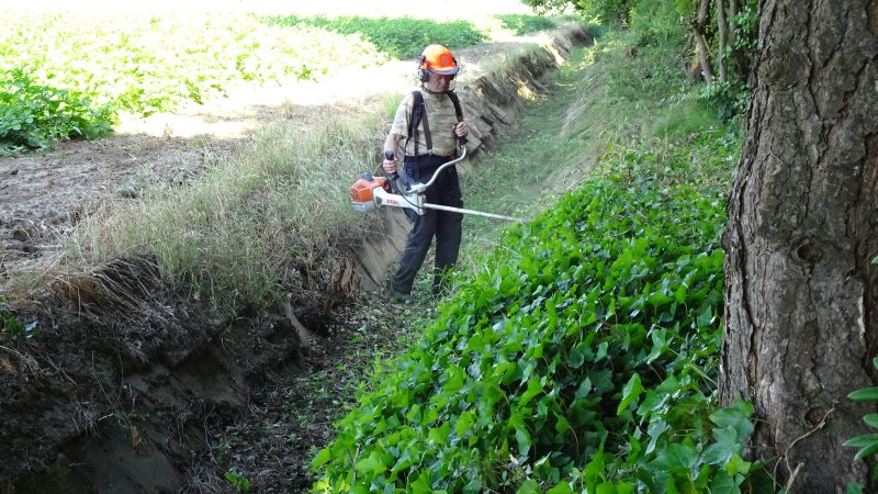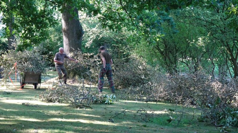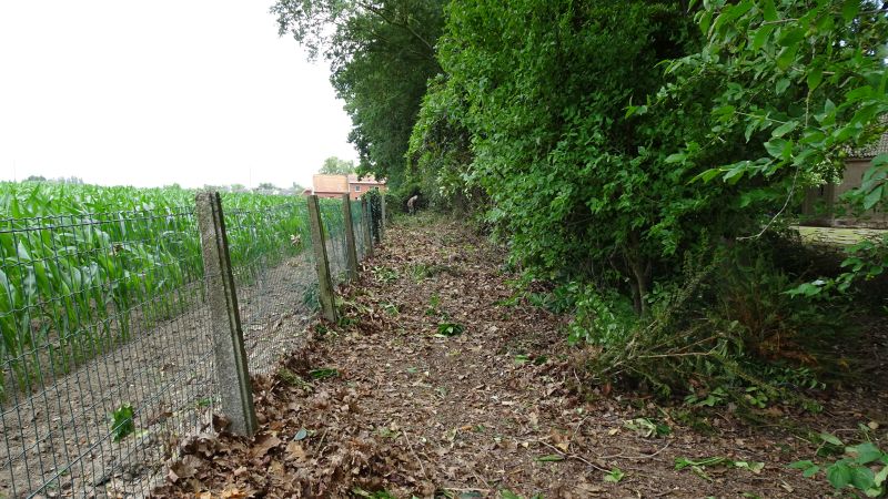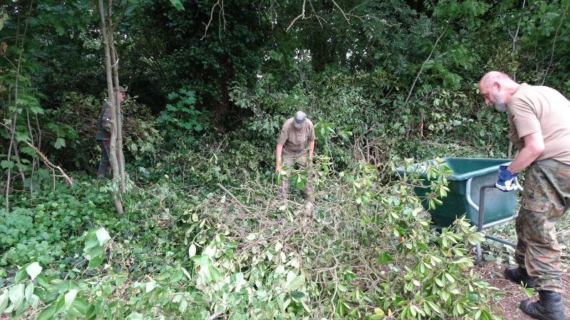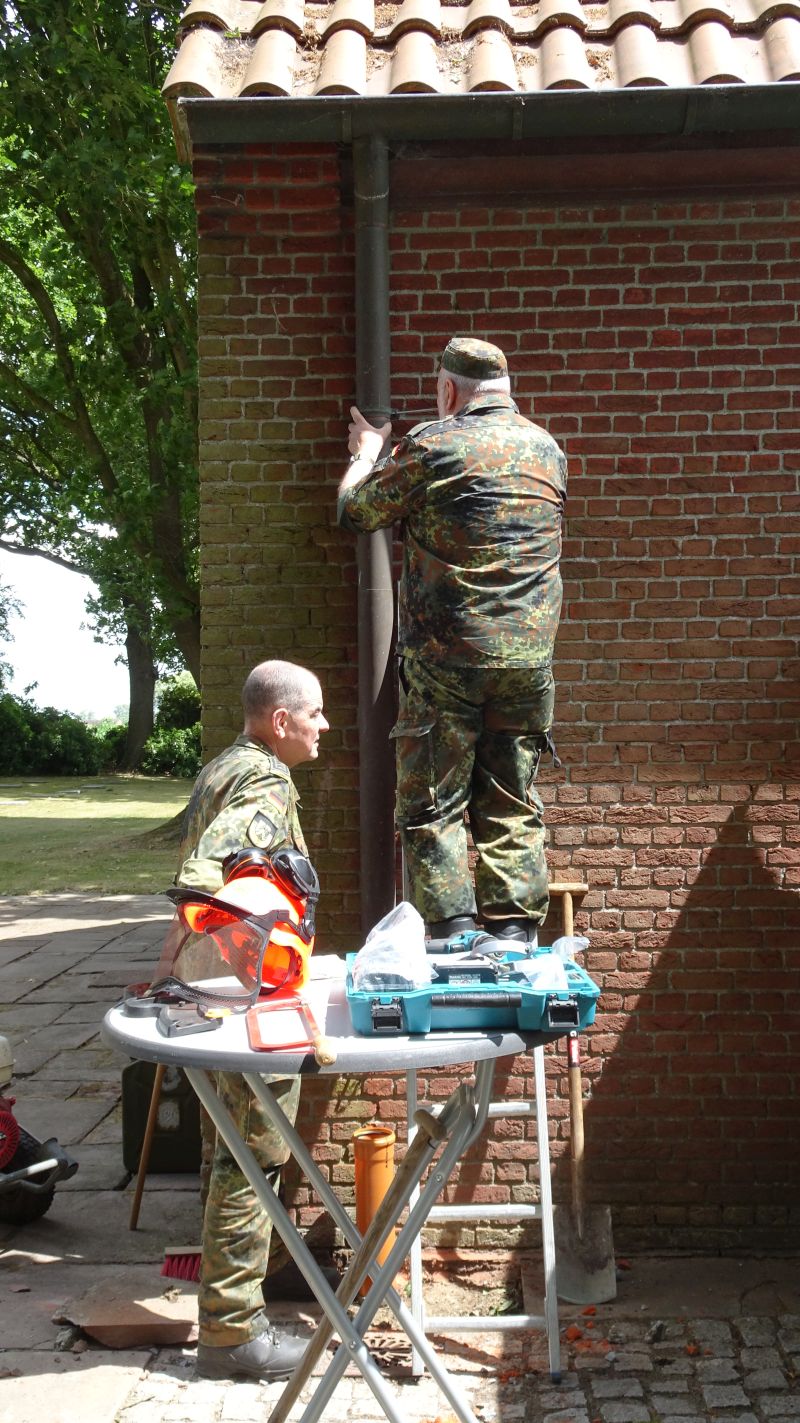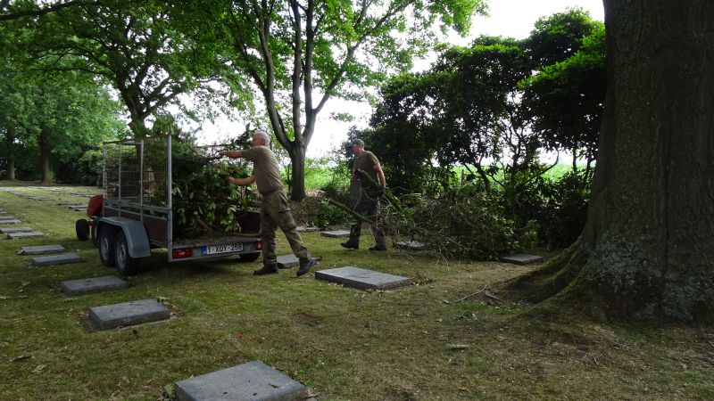 Die Reservisten hatten sich, für den Volksbund kostenlos, im Eingangsgebäude des Friedhofs einquartiert. Es war ausgestattet mit einem Gemeinschaftsraum, einer Küche mit Kühlschrank, Herd und Spüle, einer Dusche und zwei Toiletten – etwas spartanisch, aber für 13 Tage ausreichend. Die Kriegsgräberstätte wurde offensichtlich zuletzt vor acht Jahren saniert. Sie hatte es dringend wieder nötig. Bäume und Büsche mussten auf 400 Metern Länge entlang des Friedhofszauns entfernt werden, da sie in die Nachbargrundstücke hineinwuchsen. Die drei belgischen Kameraden kümmerten sich mit zwei Motorsägen vorwiegend um die Sägearbeiten. Aufgrund des dichten Bewuchses waren die Sägen ständig im Einsatz. Zwischendurch musste eine gerissene Sägekette erneuert werden.